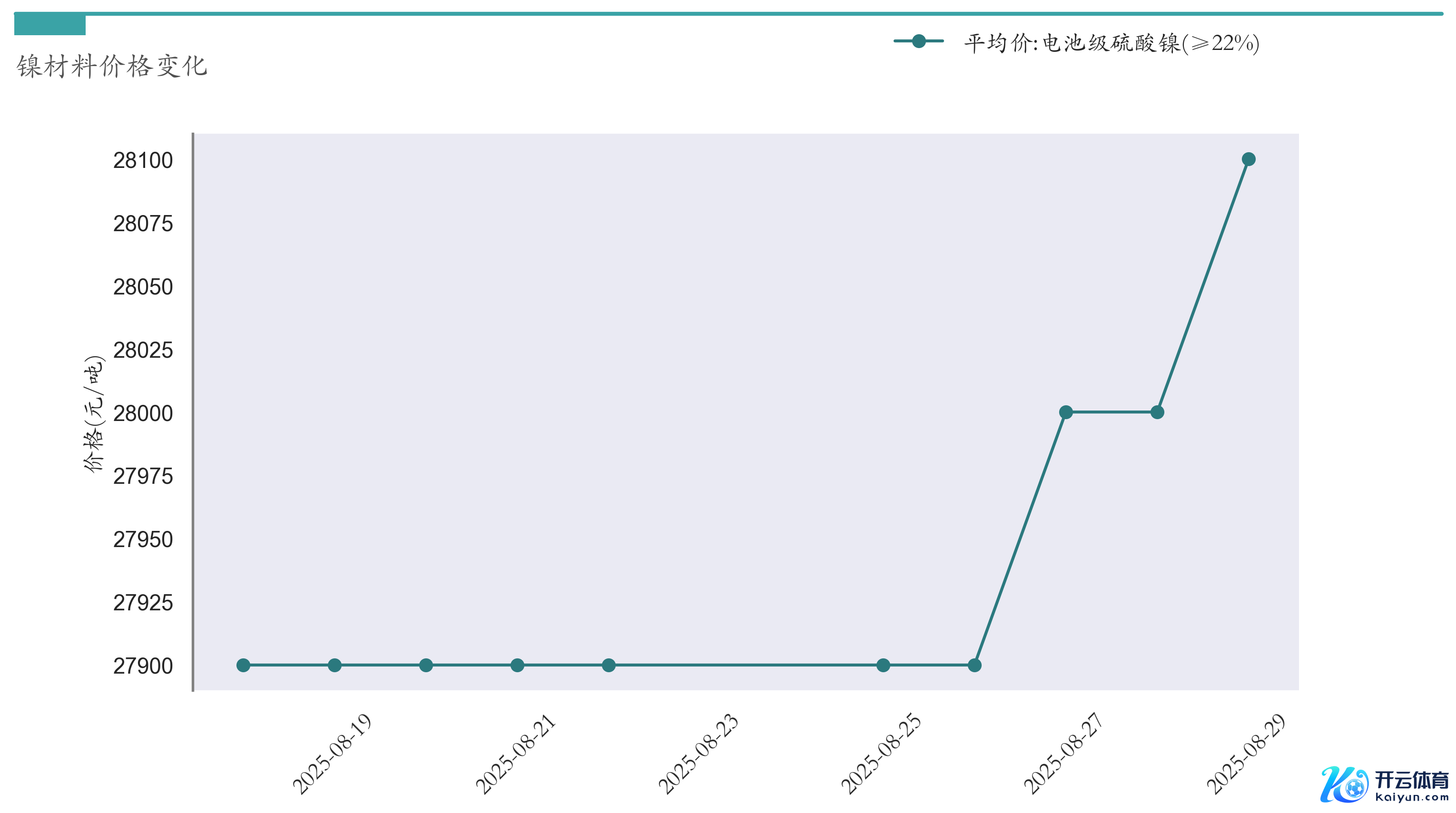 达成8月29日,电板级硫酸镍平均报价为28100元/吨,较8月22日上升200元/吨。近两周镍材料价钱变化如下图所示:
