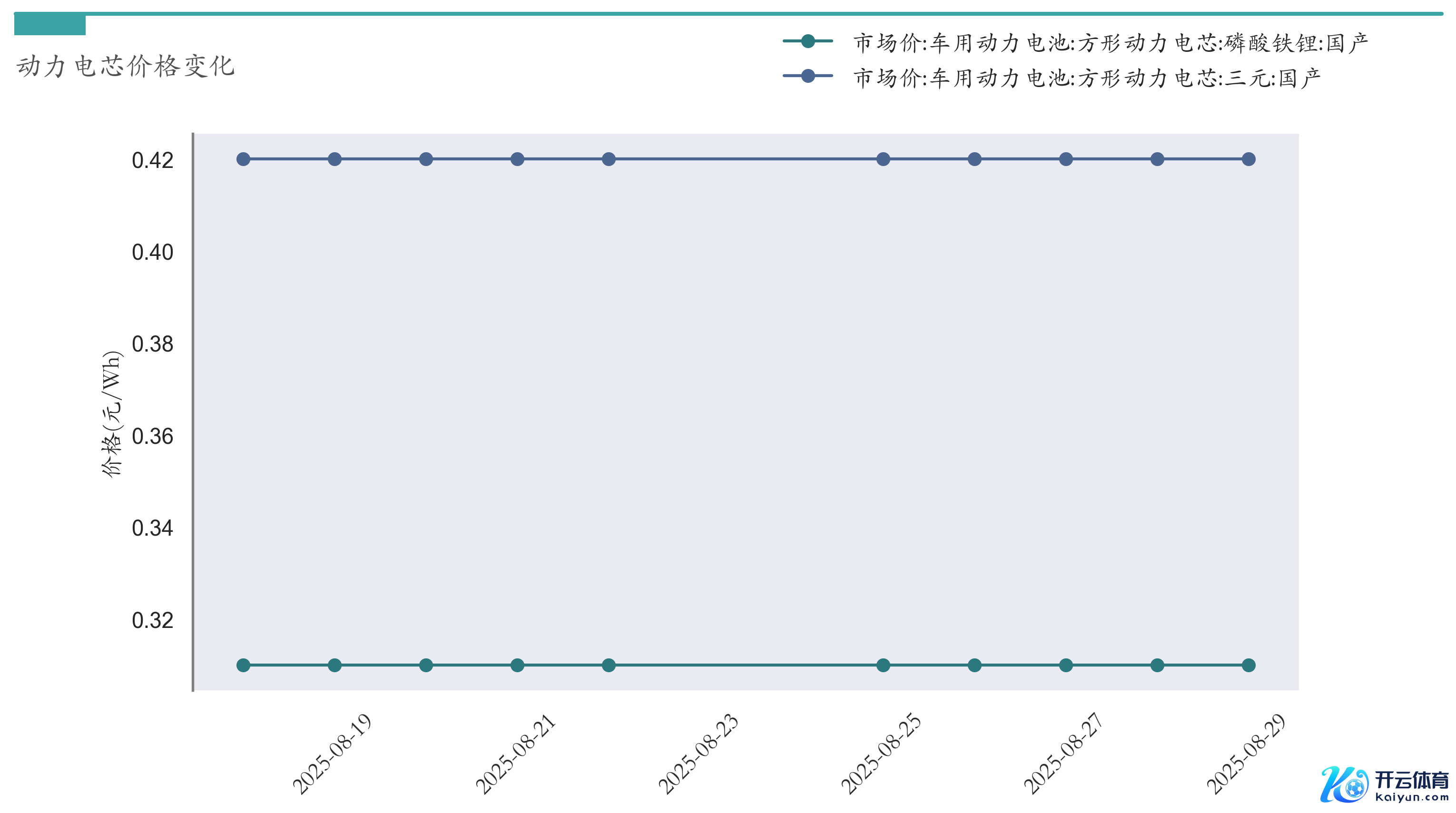 达成8月29日,方形能源电芯(磷酸铁锂)市集报价为0.31元/Wh,较8月22日握平。方形能源电芯(三元)市集报价为0.42元/Wh,较8月22日握平。近两周能源电芯价钱变化如下图所示: