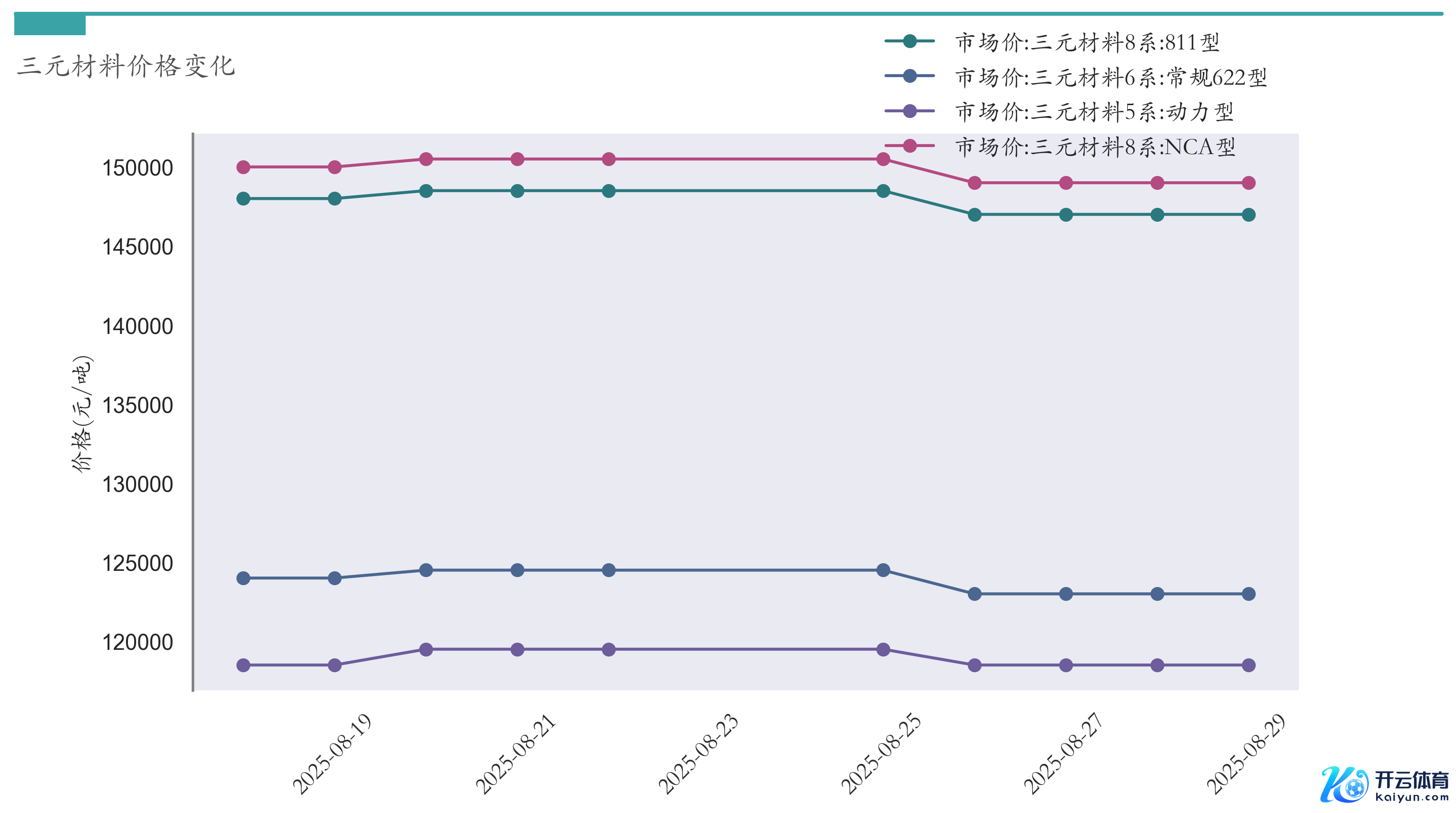 达成8月29日,三元材料8系:811型市集报价为147000元/吨,较8月22日下落1500元/吨。三元材料8系:NCA型市集报价为149000元/吨,较8月22日下落1500元/吨。三元材料6系:惯例622型市集报价为123000元/吨,较8月22日下落1500元/吨。三元材料5系:能源型市集报价为118500元/吨,较8月22日下落1000元/吨。近两周三元材料价钱变化如下图所示: