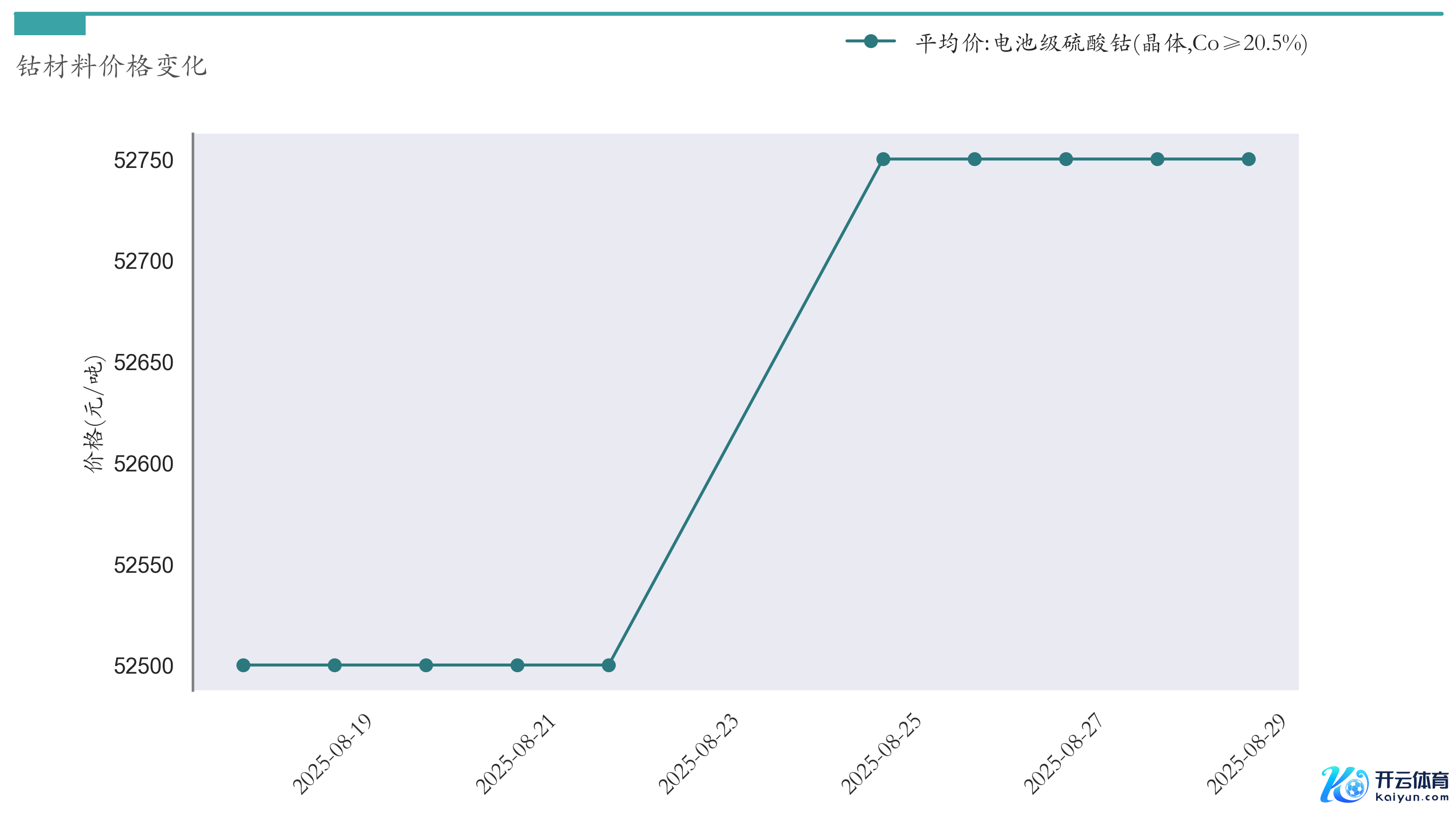 达成8月29日,电板级硫酸钴平均报价为52750元/吨,较8月22日上升250元/吨。近两周钴材料价钱变化如下图所示: