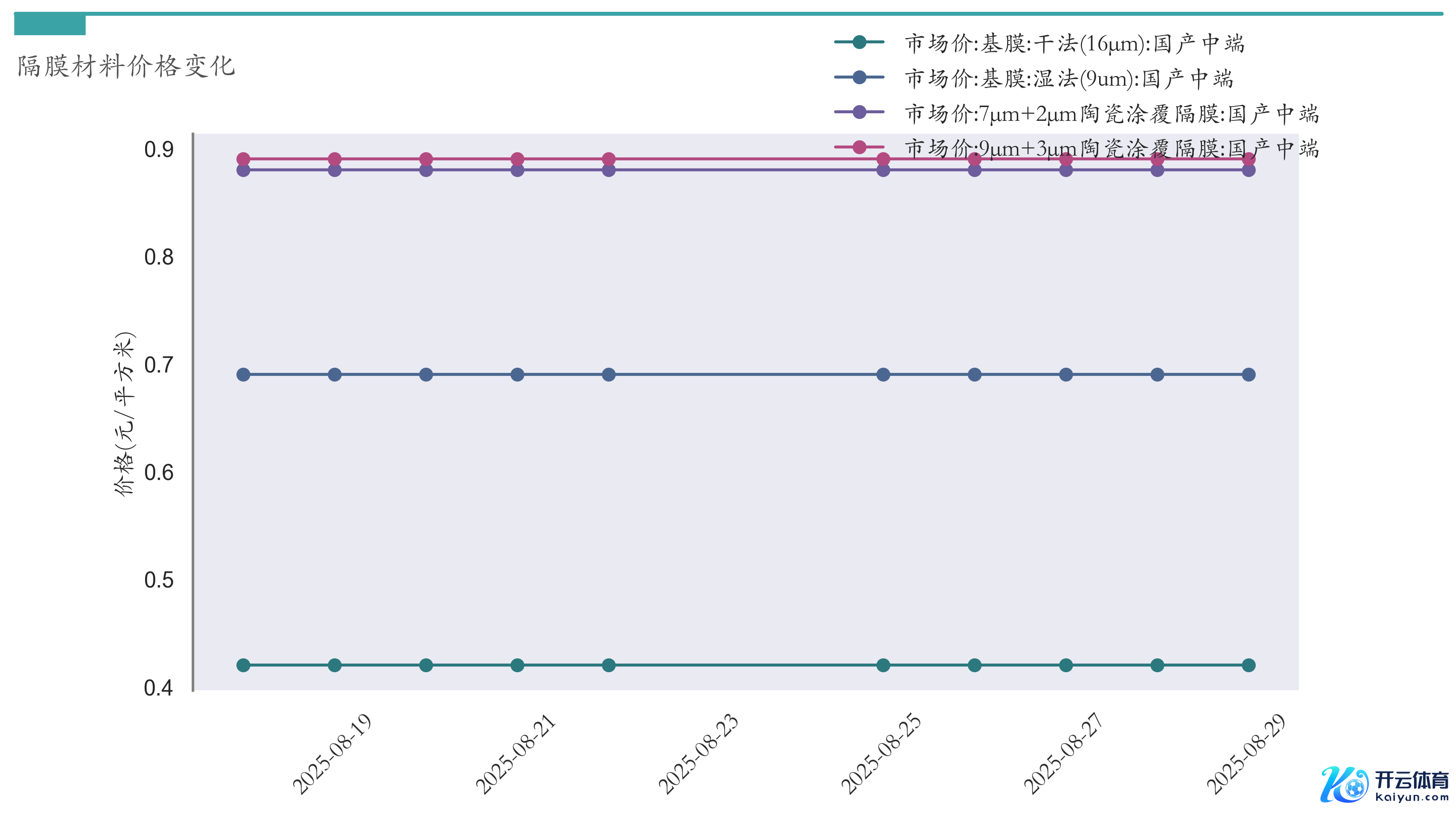 达成8月29日,干法16μm基膜市集报价为0.42元/平淡米,较8月22日握平。湿法9um基膜市集报价为0.69元/平淡米,较8月22日握平。7μm+2μm陶瓷涂覆隔阂市集报价为0.88元/平淡米,较8月22日握平。9μm+3μm陶瓷涂覆隔阂市集报价为0.89元/平淡米,较8月22日握平。近两周隔阂材料价钱变化如下图所示: