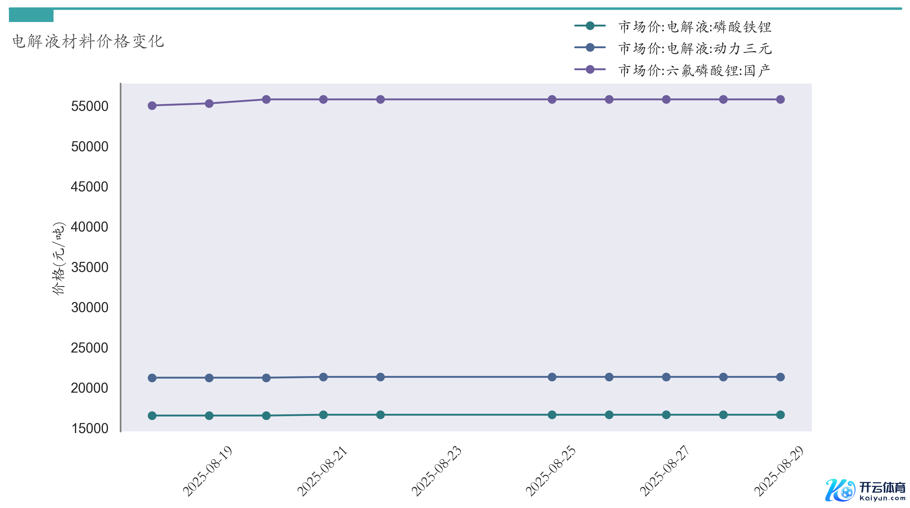 达成8月29日,六氟磷酸锂市集报价为55750元/吨,较8月22日握平。电解液(磷酸铁锂)市集报价为16600元/吨,较8月22日握平。电解液(能源三元)市集报价为21300元/吨,较8月22日握平。近两周电解液材料价钱变化如下图所示: