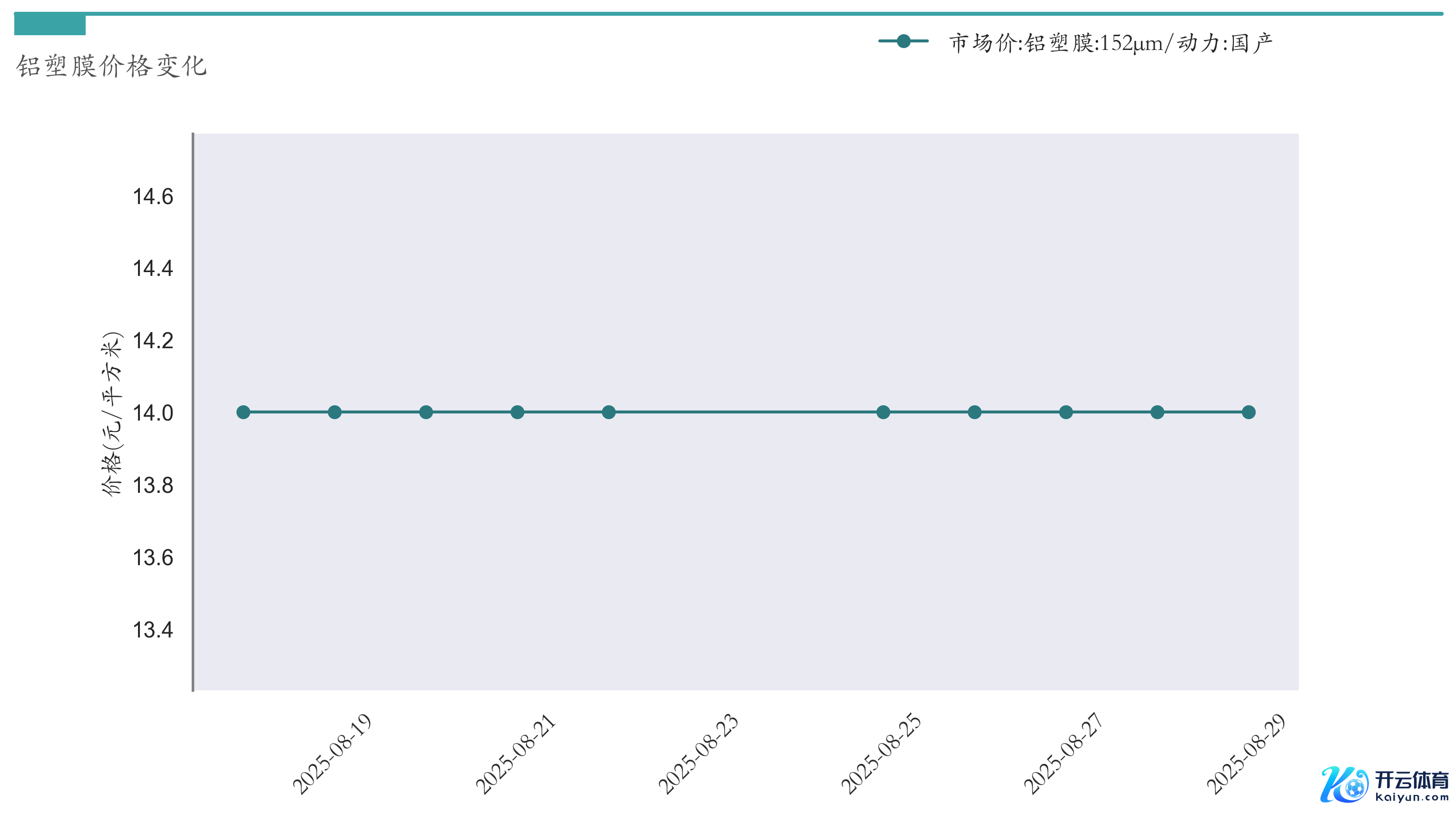 达成8月29日,152μm铝塑膜市集报价为14元/平淡米,较8月22日握平。近两周铝塑膜价钱变化如下图所示: