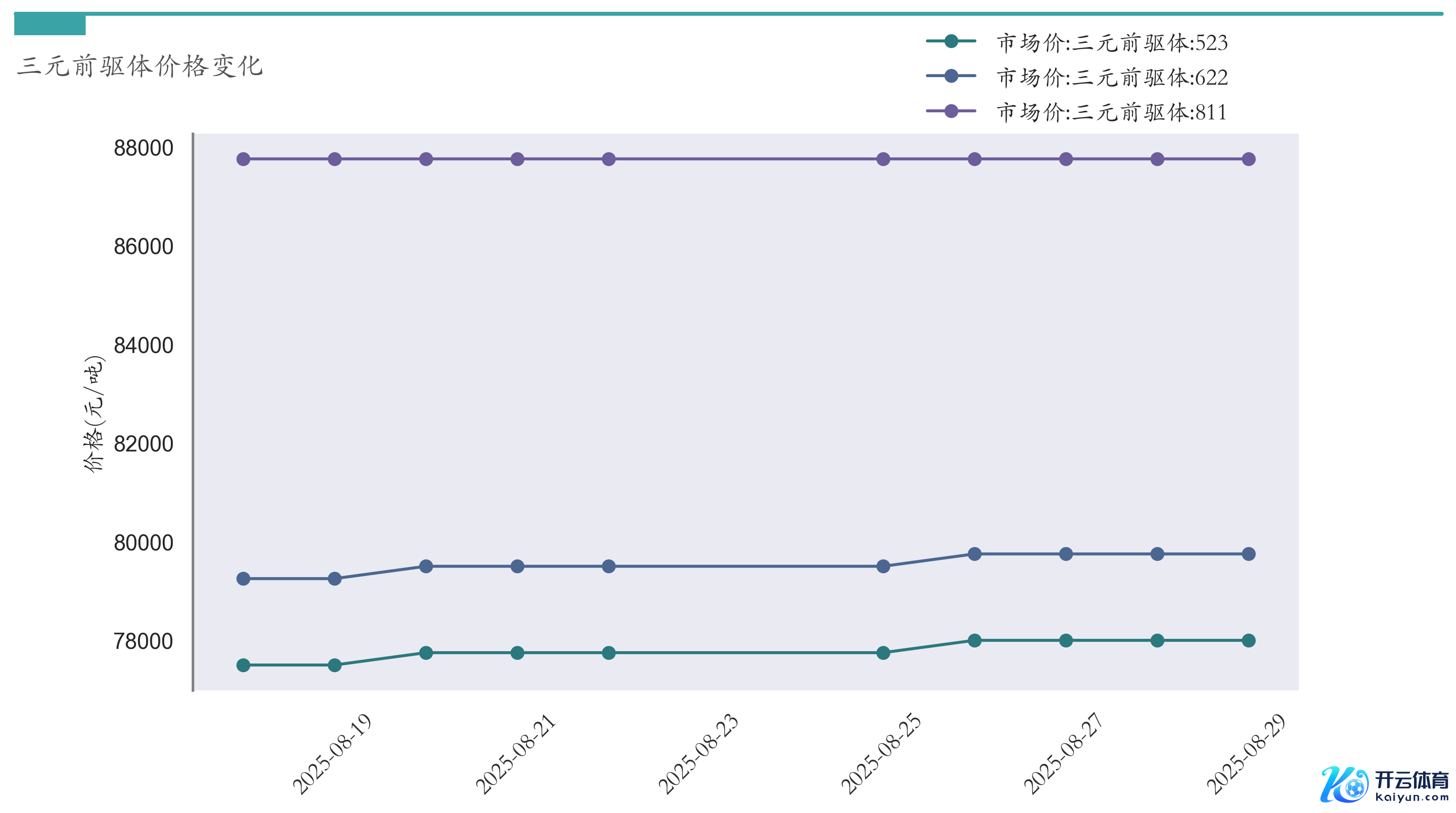 达成8月29日,三元先行者体811市集报价为87750元/吨,较8月22日握平。三元先行者体622市集报价为79750元/吨,较8月22日上升250元/吨。三元先行者体523市集报价为78000元/吨,较8月22日上升250元/吨。近两周三元先行者体价钱变化如下图所示:
