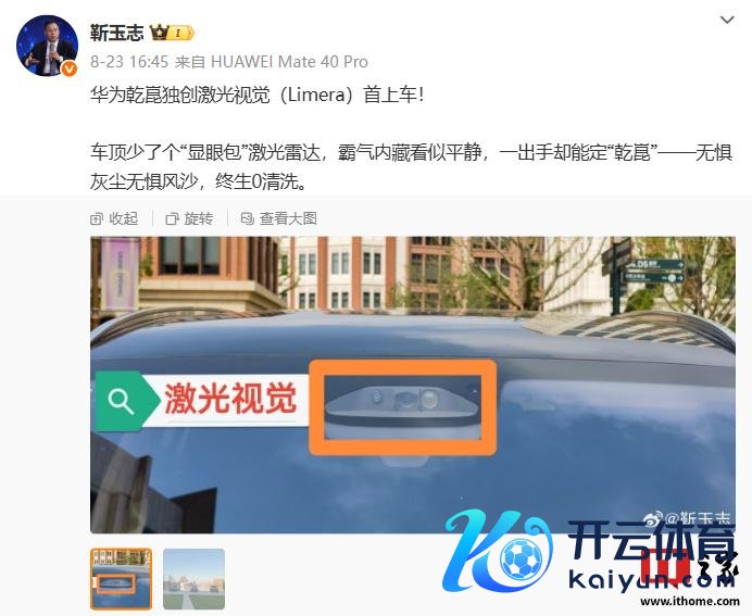 IT之家 9 月 8 日讯息,智能汽车处罚决议 BU CEO 靳玉志上月发文共享,华为乾崑首创激光视觉(Limera)首上车,车顶少了个“显眼包”激光雷达。他还暗示,该决议无惧灰尘无惧风沙,终身 0 清洗。