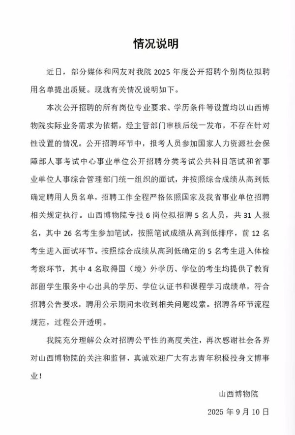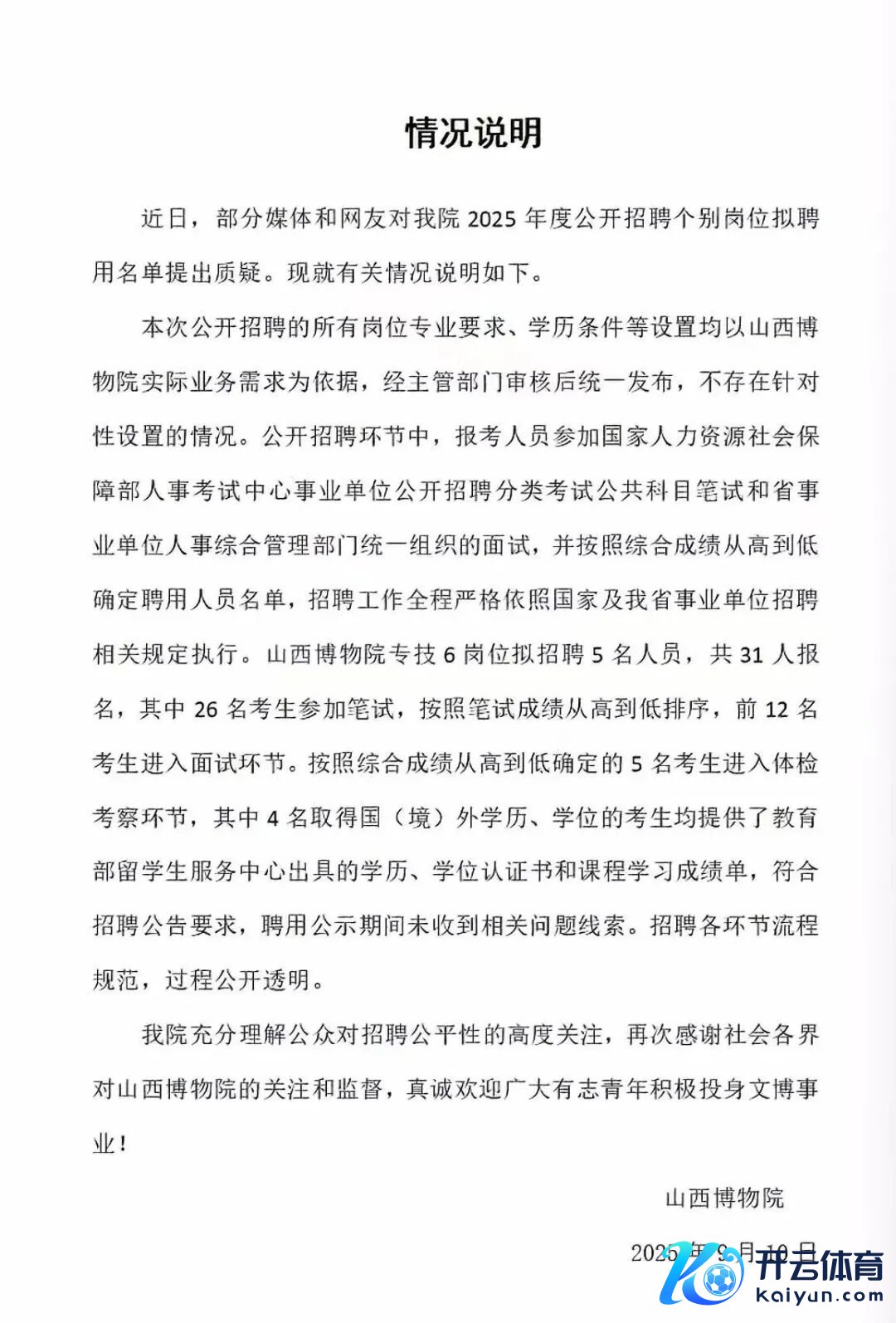 开yun体育网山西博物院修起“拟遴聘名单遭质疑”:招聘过程圭表,过程公开透明-开云(中国大陆)Kaiyun·官方网站 - 登录入口